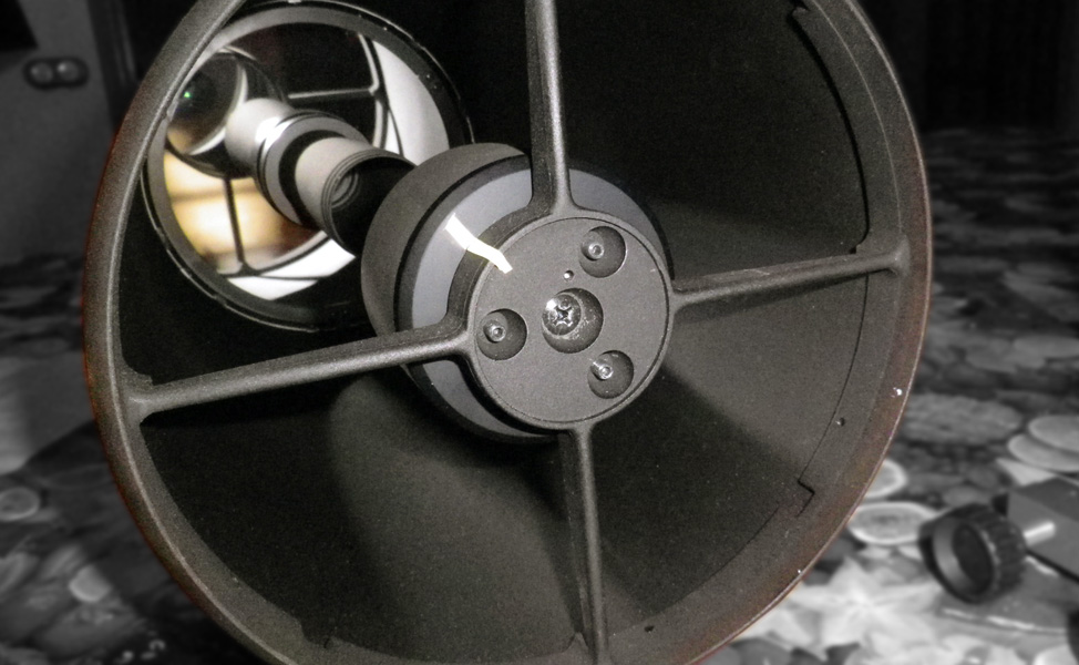 «Remove the secondary mirror and holder from the front spider. Don’t forget to mark the orientation first. Aim the scope approximately horizontally. Remove the model name sticker and loosen the 3 collimation screws (fig 1-1) one full turn. Remove the Phillips screw in the center of the spider, being careful not to lose the washers that may drop out from between the spider and the secondary (they may stick to either one). Leave the spider in place. To get the secondary assembly out of the tube, aim it at the tube wall and carefully slide it between the vanes.»